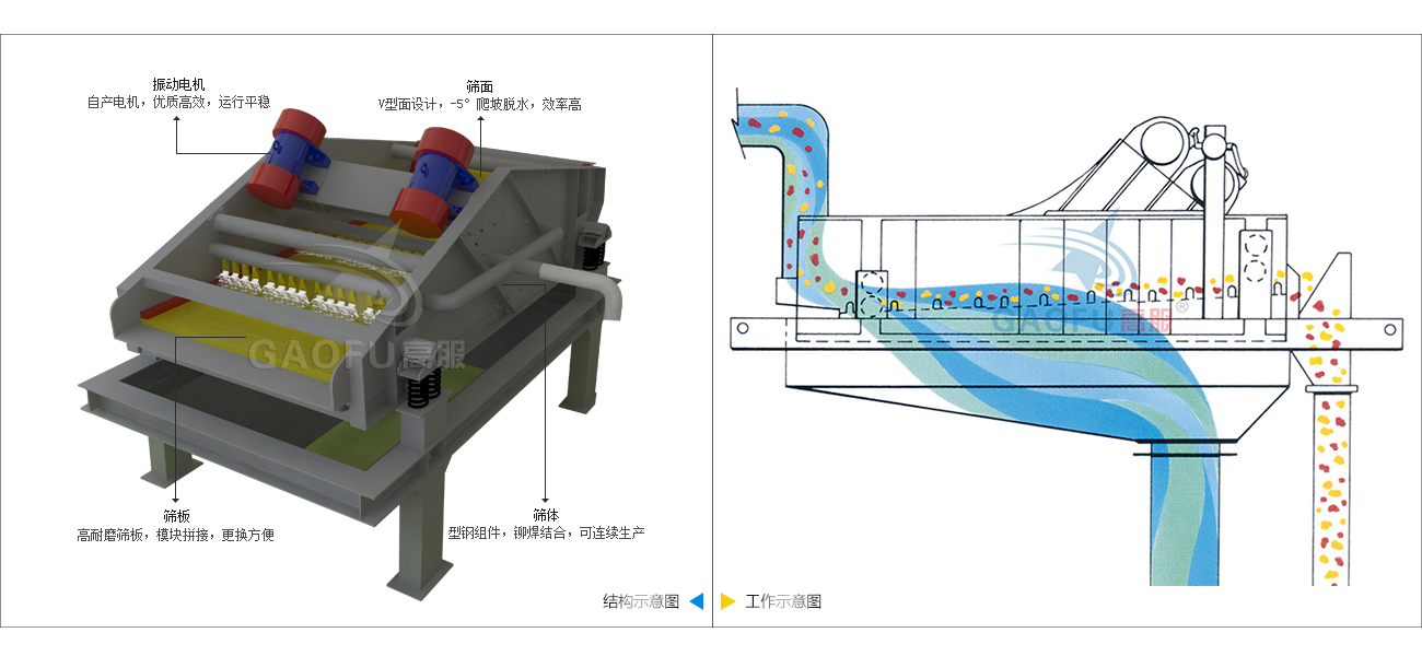 脫水篩又稱高頻脫水篩,通過(guò)激振力改變了礦漿表面的水張力,漿水透過(guò)篩網(wǎng)成為篩下物,而微細(xì)物料被篩網(wǎng)阻隔形成濾層受振動(dòng)力影響向前運(yùn)動(dòng)排出。脫水篩主要用于選礦行業(yè)的尾礦脫水、水洗石英砂脫水和陶瓷泥漿脫水,以及電力、制糖、制鹽等工業(yè)部門對(duì)中細(xì)顆粒物料進(jìn)行干濕式分級(jí)、脫水、脫介和脫泥。