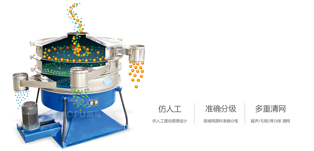 搖擺篩是一種仿人工搖動的低頻旋振篩,其原理是:瞬時運動為沿徑向的位移和以此位移為軸的圓周運動的合成(螺旋運動),即可調節偏心距的激振器產生了非線性三維運動,物料也產生同樣的近似手動作業的運動,從而達到篩分之目的,再配合篩分附件可獲得更加理想的篩分效果適合于圓形狀、圓柱狀、片狀、乃至 于規則形狀易堵網且需要精細篩分的物料。